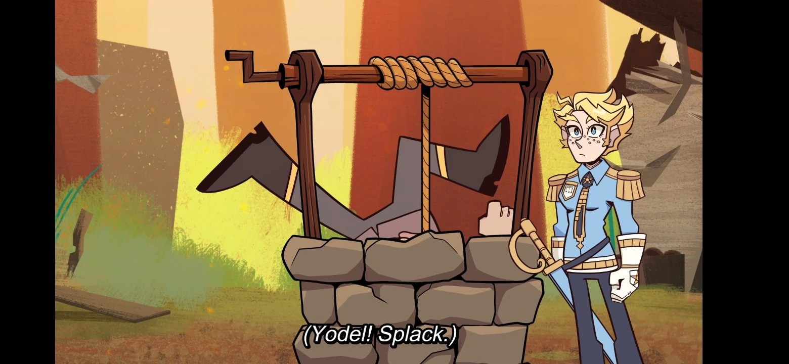 A nearby man says that the well hasn't had water in it for 20-odd years, as he's been watching it for that long. Ramsey asks how it pays, only for the man to respond that no one gets paid in Redwood Run. Ramsey points out that there is now money in the well, causing the man to immediately jump in after it. Percy puts her hand on her chin, seemingly over the strange event, only for her to then realize she's never actually been to Canada. Another man takes the other man's seat and job as well watcher before Percy's rouge tower zaps him, causing him to fall backward. He then monotonously exclaims he's been promoted to sky watcher. Percy congratulates him before Ramsey rushes them along on their quest to catch Bugsy.